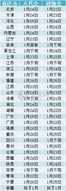 | 注:資料來源于各省日?qǐng)?bào),人大、政協(xié)網(wǎng)站或當(dāng)?shù)匦麄鞑块T,內(nèi)容截至1月5日,實(shí)際時(shí)間以當(dāng)?shù)貢?huì)議召開時(shí)間為準(zhǔn)。 |