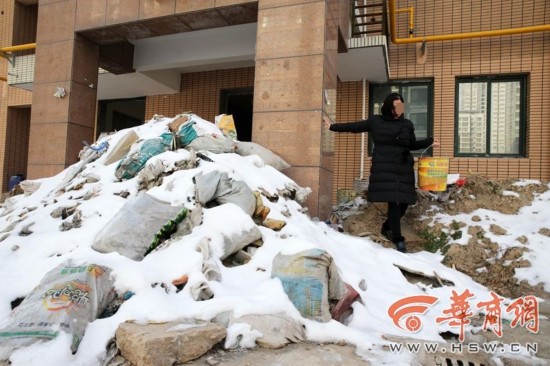 看著新建成的住宅樓大門被建筑垃圾堵住,位于城東太元路的匯林華城東區(qū)8、9兩棟樓的業(yè)主們心中五味雜陳。
