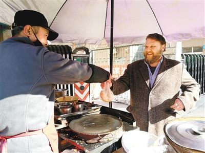 每天上午,只要有時(shí)間,他都會(huì)準(zhǔn)時(shí)來到西安外國(guó)語大學(xué)雁塔校區(qū)北門外,買一份煎餅果子當(dāng)早餐。煎餅攤的張老板和他是“老熟人”了!拔业闹形娜窃陲堭^點(diǎn)餐時(shí)練習(xí)出來的,比如‘泡饃’‘biangbiang面’‘肉夾饃’,全是我的最愛!奔s翰開玩笑地說,西安人的學(xué)習(xí)熱情很高,知道他來自美國(guó)后,通常會(huì)跟他練習(xí)英語口語,沒人找他聊中文。因此,他的中文水平至今也沒能提高多少!拔业母改浮⑴笥褋砦靼矔r(shí),我可是他們的美食導(dǎo)游。哪家羊肉泡饃好吃,我都清楚!奔s翰笑稱自己已經(jīng)養(yǎng)成了“陜西胃”,特別愛吃西安的各類美食。