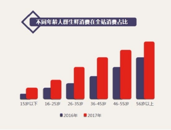 對比不同年齡段的消費結(jié)構(gòu)可以發(fā)現(xiàn),50后、60后和70后用戶的生鮮消費在全站消費占比最高,可見“銀發(fā)經(jīng)濟”效應在生鮮電商領域更為明顯,網(wǎng)上買菜、買肉的習慣也在逐步取代菜市場在中老年人心里的地位。