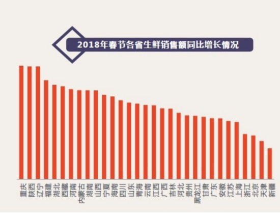 與2017年春節(jié)期間相比,2018年春節(jié)生鮮消費同比增長最快的省份包括重慶、陜西、遼寧、福建、湖北,其銷售額同比增長均超過300%。(李程)