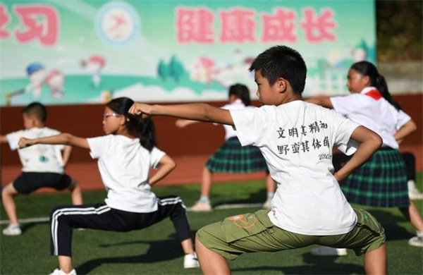 7月9日,在陜西省安康市平利縣老縣鎮(zhèn)中心小學(xué)的操場上,學(xué)生們在課后參加武術(shù)社團活動。新華社記者李一博 攝