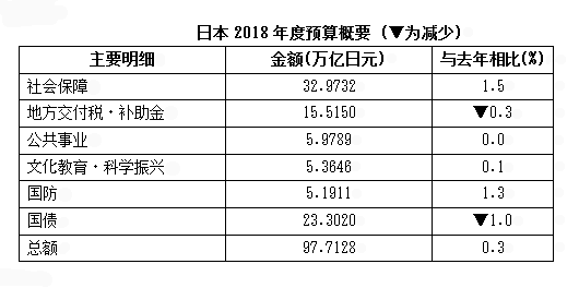 人民網(wǎng)東京3月29日電(吳穎)據(jù)日本共同通信社報道,28日,日本2018年度預(yù)算在日本國會參議院全體會議上,憑借聯(lián)合執(zhí)政的自民、公明兩黨議員的支持,以多數(shù)贊成表決通過。該預(yù)算總額達(dá)97.7128萬億日元(約合人民幣5.8萬億元),連續(xù)六年刷新歷史記錄。據(jù)報道,2018年度預(yù)算規(guī)模比2017年度高出0.3%;其中包括發(fā)行33.7萬億日元債券。日本首相安倍晉三向媒體表示,“將迅速執(zhí)行預(yù)算,向中小企業(yè)和地方送去經(jīng)濟(jì)復(fù)蘇的暖風(fēng)!