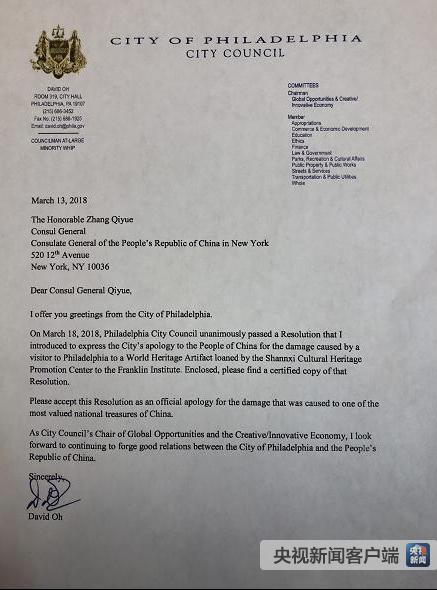 目前,這份書(shū)面道歉決議已經(jīng)正式呈交中國(guó)駐紐約總領(lǐng)事章啟月,得到了中方的書(shū)面回復(fù),并于當(dāng)?shù)貢r(shí)間4月5日轉(zhuǎn)呈陜西省文物交流中心。(央視記者 王萌 王風(fēng)華)