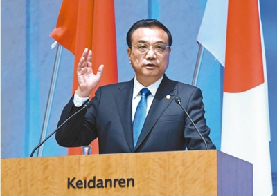 當(dāng)?shù)貢r(shí)間5月9日中午,國(guó)務(wù)院總理李克強(qiáng)在東京經(jīng)團(tuán)聯(lián)會(huì)館與日本首相安倍晉三、韓國(guó)總統(tǒng)文在寅共同出席第六屆中日韓工商峰會(huì)并致辭。 |