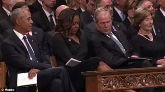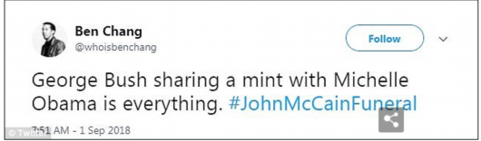 原標題:小布什在麥凱恩追悼會上給米歇爾傳糖 美國網友被暖到了