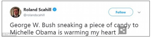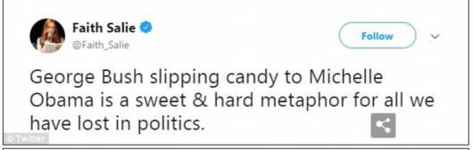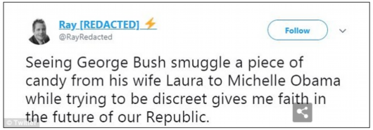 “看到小布什從妻子手中接過糖果給米歇爾,同時又試圖保持謹慎,讓我對共和黨的未來充滿希望!