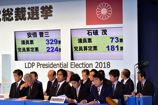 自民黨總裁選舉于20日舉行,現(xiàn)任總裁安倍晉三與自民黨前干事長石破茂展開角逐。最終,在全部810票中,安倍共獲得553票,石破茂獲得254票。