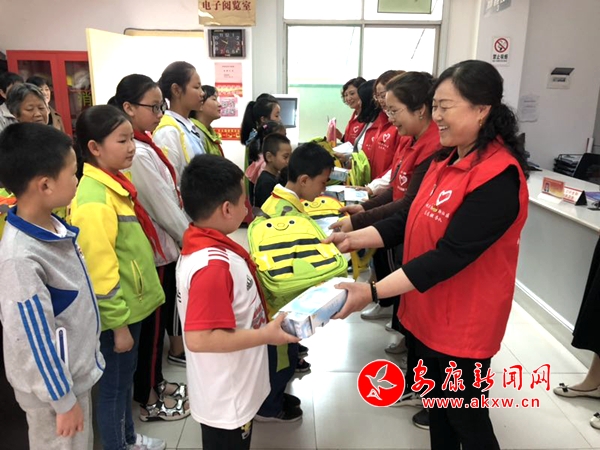 正午12點,志愿者早已集合在了社區(qū)大廳,把準備好的書包、牛奶等物品擺在了桌子上,熱情洋溢的迎接16組孩子和家長們的到來。大家坐下后,志愿者們關切地詢問孩子們的學習和生活情況,向孩子們表達了節(jié)日的祝福,并送上了節(jié)日的禮物,抱著好看的新書包,孩子們開心不已。