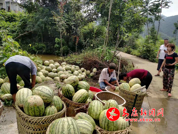羅朝艷帶領(lǐng)著村民,頂著烈日采摘西瓜,統(tǒng)一收購(gòu)貧困戶西瓜,然后在集中一起,裝車(chē)、轉(zhuǎn)運(yùn)、16噸西瓜用廂式大貨車(chē)運(yùn)到浙江溫州一帶統(tǒng)一出售。預(yù)計(jì)收入50000元左右,雖然天氣炎熱,但羅朝艷的臉上洋溢著豐收的喜悅。