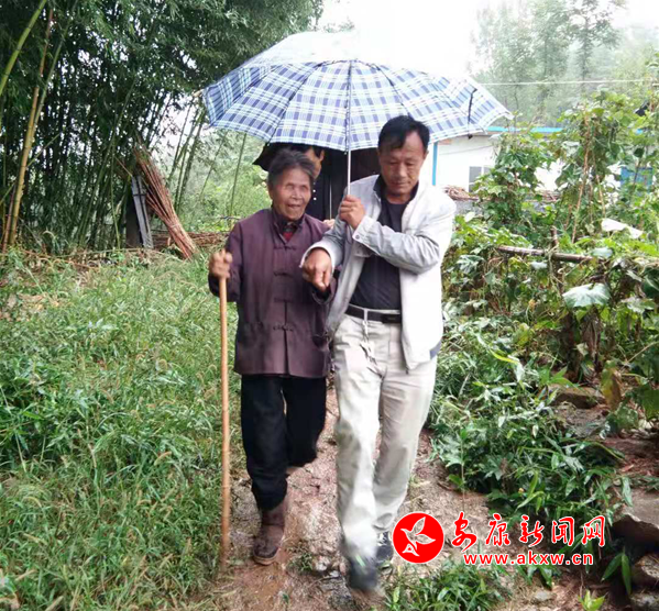 本網(wǎng)訊(通訊員 王文藝 安靜)“阿姨,您走慢點,今天雨下的大,路比較滑,小心摔倒”,這是三同村一組正在發(fā)生的一幕,貧困戶黃龍翠今年72歲了,連日來陰雨不斷,導致她所居住的土坯房垮塌,再加上她是個盲人,上下樓梯不方便,這使得黃龍翠更加焦慮,幫扶干部三同村黨支部書記陳平星得知后,和另外兩名幫扶干部黃貴、張垂海一起來到黃龍翠家,把她平安地轉(zhuǎn)移到安全住房中。