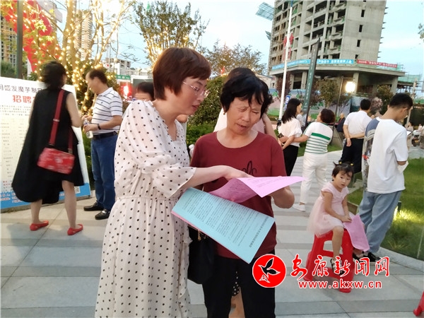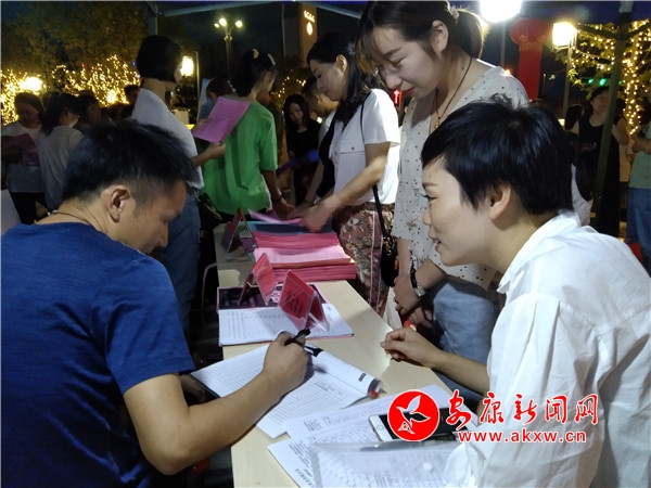當(dāng)晚七點,各展位攤前,人來人往,熱鬧非凡,有帶著孩子的婦女為丈夫咨詢的,有老人為自己的兒女詢問的,也有剛畢業(yè)的大學(xué)生來找合適崗位的,前來咨詢的絡(luò)繹不絕。家住城關(guān)鎮(zhèn)御景龍城的蔣友愛女士,早早地來到招聘現(xiàn)場,在展位攤前駐足、詢問招聘信息。據(jù)她介紹,今天在這里是想給女兒找一個合適的崗位,女兒去年大學(xué)畢業(yè),一直呆在西安,最近想回家在家附近找個工作。她表示,今天的崗位多,好多企業(yè)開出的工資待遇也還不錯,把招聘信息拿回去拍給女兒看,女兒能留在身邊就業(yè)掙錢,還能照顧家里,最好不過啦。
