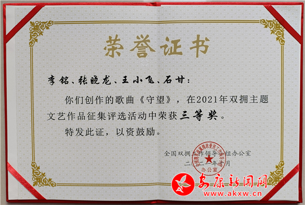 本網(wǎng)訊(通訊員 歐定揚(yáng))漢陰縣文旅廣電局文化干部李銘與其戰(zhàn)友創(chuàng)作的歌曲《守望》榮獲2021年度全國(guó)雙擁主題歌曲征集三等獎(jiǎng),據(jù)了解,這也是近幾年來(lái)漢陰縣在雙擁和文化宣傳工作上所獲得的又一獎(jiǎng)項(xiàng)。