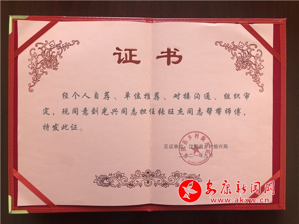 9月初,漢陰鄉(xiāng)村振興工作領(lǐng)導(dǎo)小組要求明確全縣派駐的第一書記和駐村隊員實行“師傅幫帶”,接到通知后我心里竊喜,打定主意一定要“拜”軍壩村黨總支劉光興同志為師傅。然而在我走到劉總支面前提及此事時,平時和藹可親的總支瞬間變得深沉嚴(yán)肅起來,沉默了幾秒后強調(diào)要報請上級部門批準(zhǔn)才答應(yīng)。這個舉動著實讓我犯嘀咕甚至還有點失望,內(nèi)心想著是不是劉總支不想帶我或者看不上我這個徒弟?按照縣上統(tǒng)一安排,很快就組織了“師傅幫帶”集中培訓(xùn),發(fā)放證書,并對師傅和徒弟分別提出考核獎懲 ?此拼耸马樌沓烧,我在工作中叫總支,生活中叫師傅,沒有一點違和感。
