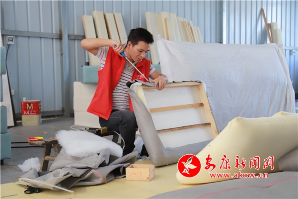 引來家具廠,村民放下鋤頭走進(jìn)車間當(dāng)工人。52歲村民鄭合芳,自從村里建起了家具廠,鄭合芳便成了廠里的一名工人,進(jìn)廠務(wù)工小半年的她不僅掌握了沙發(fā)皮套加工技術(shù),還實現(xiàn)了掙錢、看家兩不誤。“放下鋤頭進(jìn)入車間,有班上,又可以掙錢,一個月三、四千元,回去后還可以照顧家里,一舉兩得的好事。”鄭合芳說。