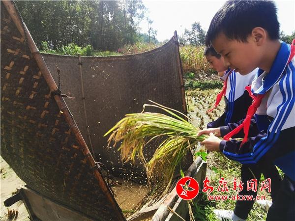 在勞動(dòng)基地,該校老師將學(xué)生分成若干小組,向孩子們介紹了水稻種植、田間管理、收割晾曬等基本常識,耐心回答了學(xué)生提出的各類問題,并向?qū)W生示范了收割稻谷、打谷脫粒等操作步驟和方法要領(lǐng),孩子們個(gè)個(gè)興致盎然,迫不及待地想要體驗(yàn)收割稻谷的喜悅。